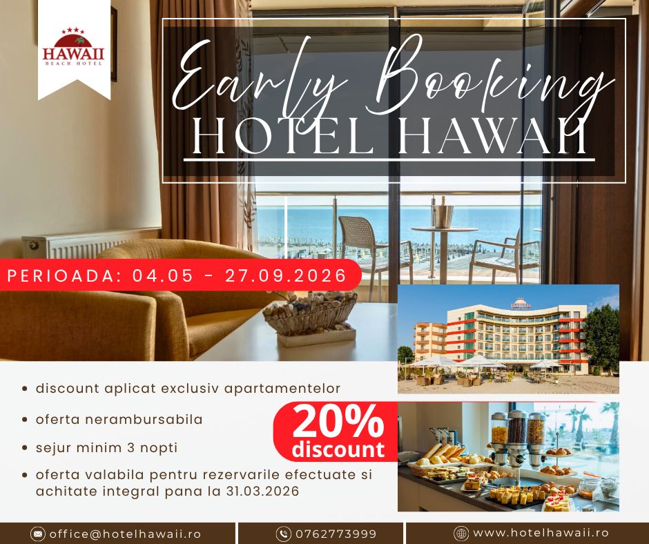 Hotelul Hawaii **** este unicat în stațiunea Mamaia datorită faptului că toate cele 25 apartamente și 5 camere duble au vedere frontală spre Marea Neagră precum și poziției privilegiate care apropie turistul de zona de nord a Stațiunii Mamaia, unde se află majoritatea cluburilor, plajelor exclusiviste și zonele de distracție.